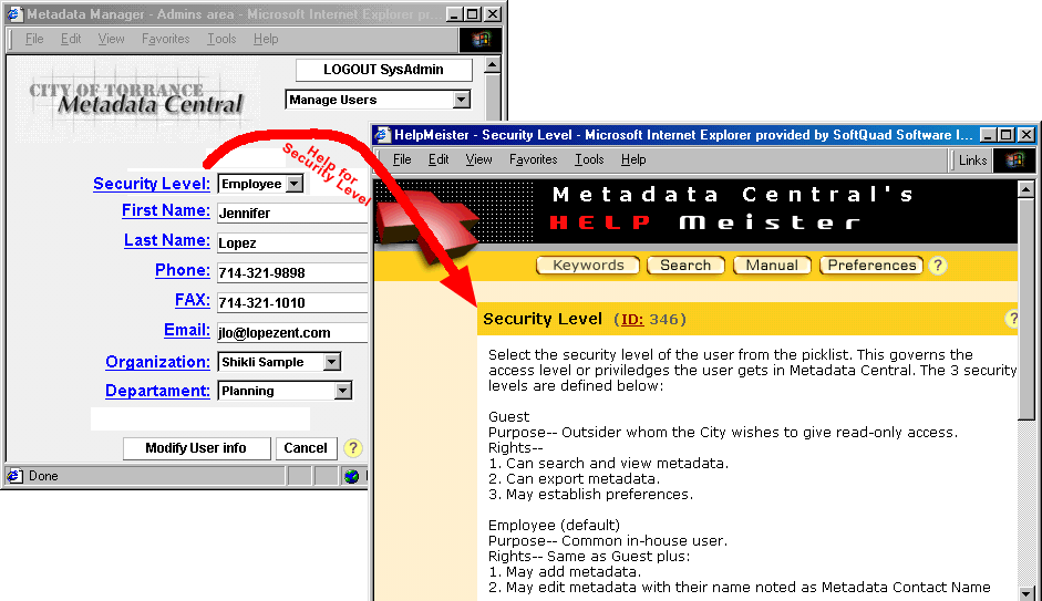 The left browser shows the Metadata Central website form used to edit users. Each field name from Security Level to Department is linked to Help Meister, as are help icons like the one to the right of the Cancel button. The user clicked on Security Level and Help Meister's pop-up help explained what the field is for and what the picklist choices mean. |