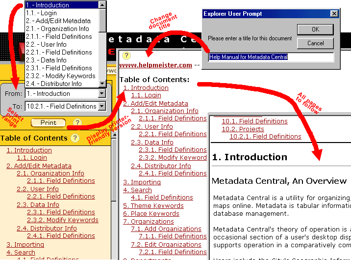 Printing from the Help Manual view of the previous slide would be convenient, but many printers produce unpredictable results from such (frame-based) pages. The "Print" button produces a printer-friendly version that is plain and easy for any printer to print. As shown below, it begins with the Table of Contents, like most books, and continues with the help records as shown in the central area of the previous slide. |