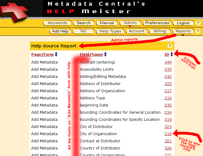 By sorting the "Field/Name" column, you quickly see the several listings of a help record as sourced from several pages and forms. For a quick peek at the help record, click its ID. Tip: bring up the subject page or form in another browser and use the report to make sure you provided help for all the fields and sections on the page or form that need it. To close this slide show, click on Get Help, the last slide along the top, to see how you can get online help regarding the report below.  |